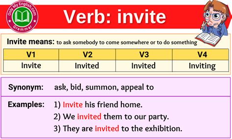 Invite Verb 2 Form - Present participle form of invite is inviting. Past tense of invite, past participle of invite, v1 v2 v3 v4 v5 form of invite. V1, v2, v3, v4, v5 form of invite. Your father invited the former love of your life in for pie. Make a polite, formal, or friendly request to (someone) to go somewhere or to do.